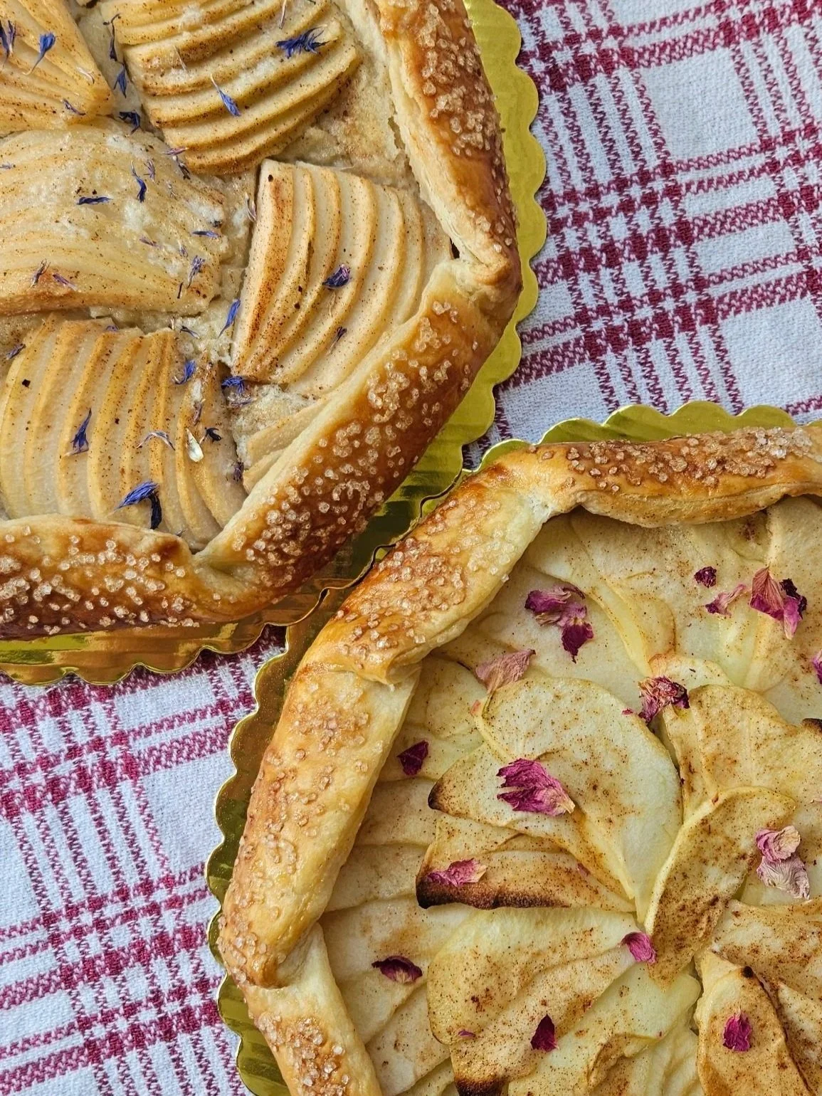 “Flaky crust with frangipane and fruits. Includes a side of vanilla bean whipped cream.”