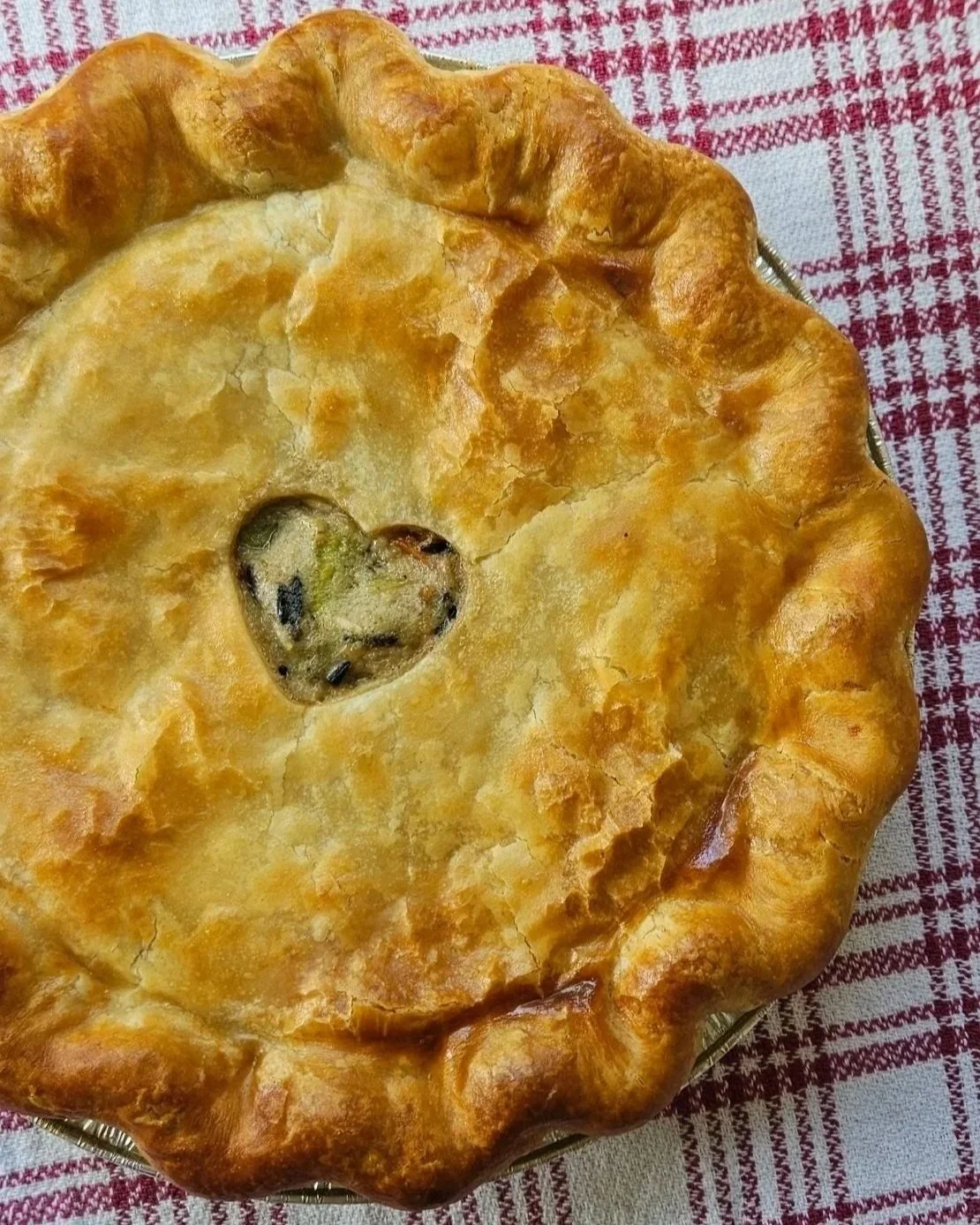 “Flaky pie crust + chicken breast pieces, creamy herb filling with peas & carrots.”